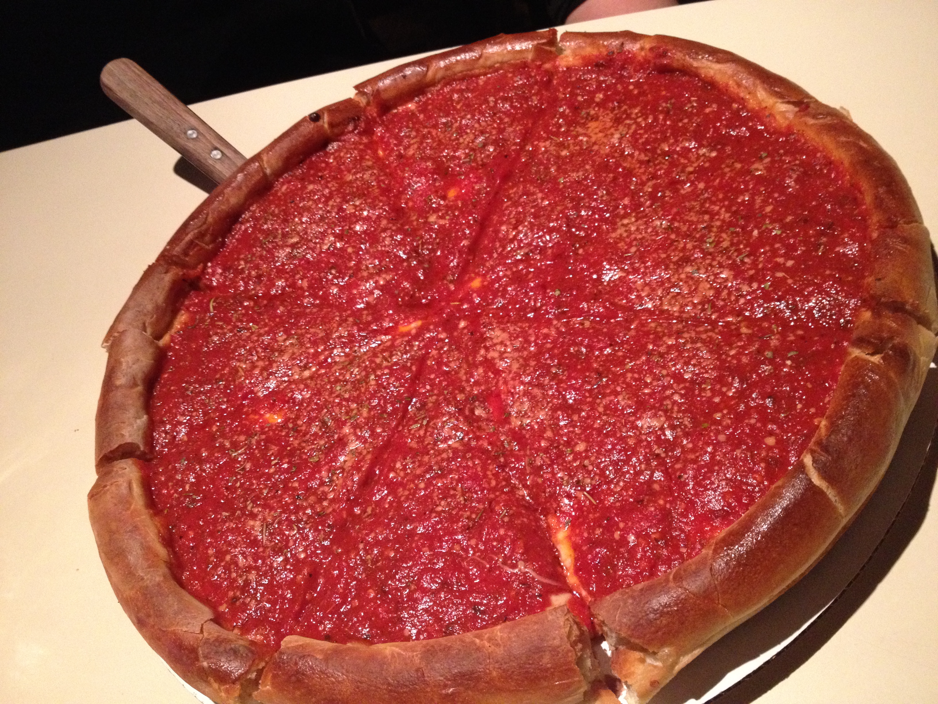The deep dish approach works in reverse order to the typical laying of pizza. Bread – followed by cheese, then toppings, then sauce. Lots of sauce – usually a half-inch or so. This sweet and spicy tomato mash is infused with strong dumpings, not dashes, of herbs and spices. The crust end, or butt, or ring, whatever you might call it is crisp on the outside, chewy on the inside and about three inches high. The crust at the base is shy of an inch. I struggle to complete three slices. I said…I STRUGGLE TO COMPLETE THREE SLICES. Has anyone ever seen me fail to consume pizza with reckless abandon? Never. This is not such a bad thing, because the great hidden quality of this pie is that it ages well. Three hours from serving, it is even better. The next day, even better than that. The cheese and sauce solidify and the crust holds it’s own against the metamorphosis. Any good pie, in my eyes, should be good the next day. This pizza is better. That is a rare.