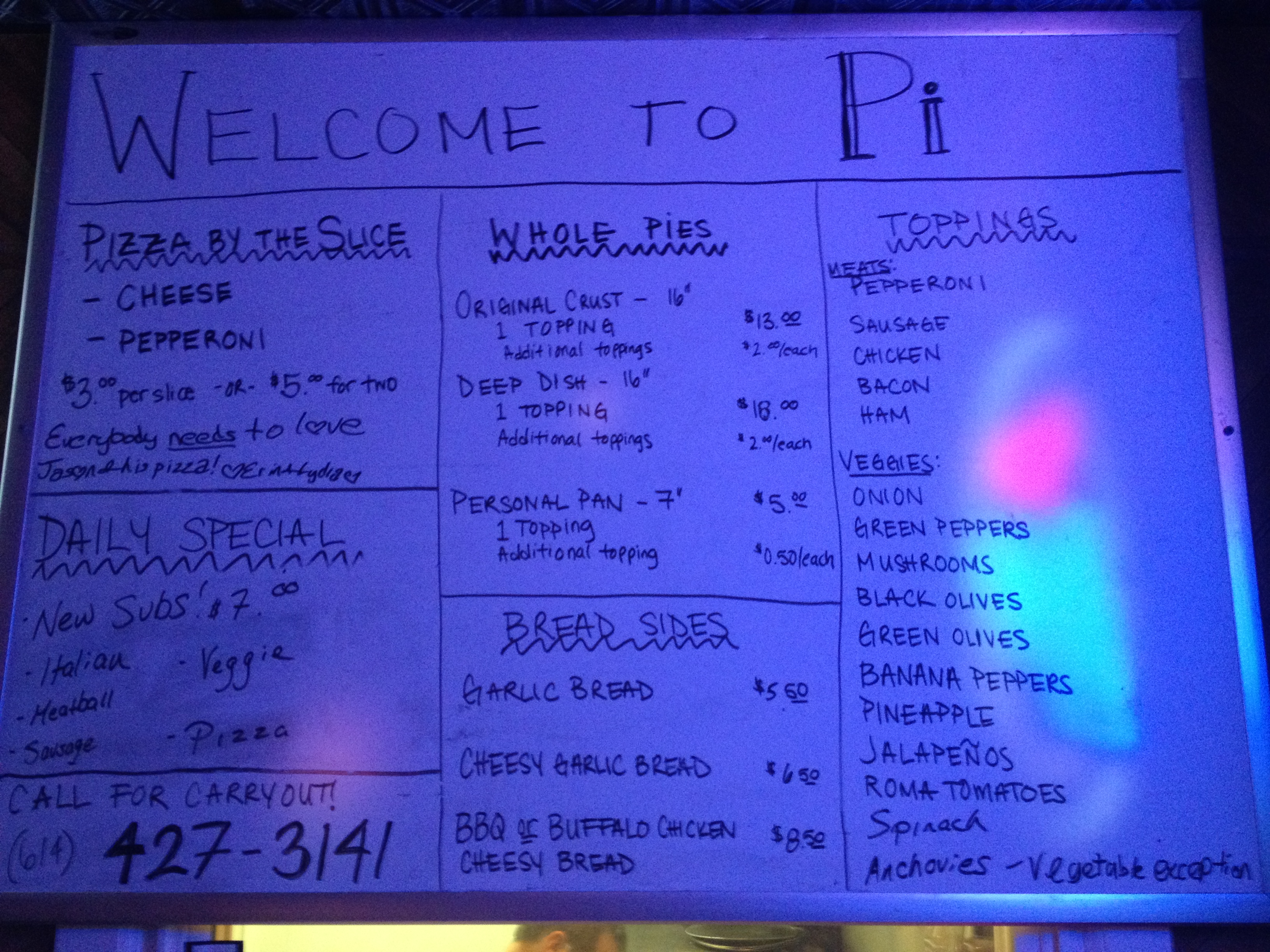 I have been stalking this place for almost year and have yet to experience anything that would lead me to find fault with this creation. It is both simple and complex at the same time. It pleases the eye and the palette. The aroma is alluring. Options include pizza, deep dish pizza, cheese breads and subs. Simple menu, complex flavors. I have sampled the deep dish most often. The addictive qualities it triggers in me should be monitored by food scientists and people more learned than I. If there is a pizza Rehab I won’t go, go, go.