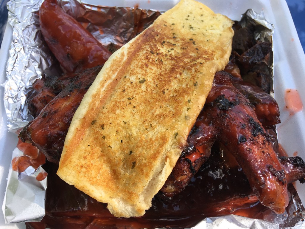 I was intrigued by the giant piece of bread topping the mountain of meat. Big Daddy’s steers clear of the typical slice(s) of generic store loaf white bread with a slightly toasted, buttered and seasoned piece of Italian style bread. This holds up well to the rigors of large amounts of BBQ sauce and can be used as a napkin in a pinch. I moved on to the small cubed pieces of brisket. These were full of flavor and not fatty. The smoked sausage was well cooked and true to the roots of the Texas style favored by Big Daddy. Next, because it was my favorite, the grilled, BBQ chicken wings were absolutely fantastic by any rating scale.