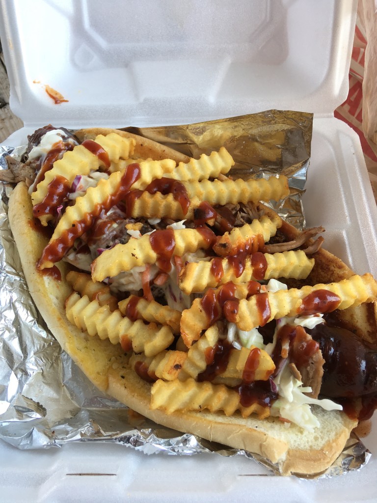 This is a good sandwich. It has many similarities to the Polish Boy of Cleveland. The Big Daddy’s tangy sauce does have the unique flavor and a slight purple or pink hue to it like the Polish Boy sauce but it is a different sandwich. I could not eat this in one sitting and I could not consume it with my hands. The use of the Italian style bread here is a plus because it holds up to the weight of the sausage, pork and fries and does not disintegrate due to the saturation of sauce. The sandwich is a good introduction to Big Daddy’s because it lets one sample about one half of the menu in one box.