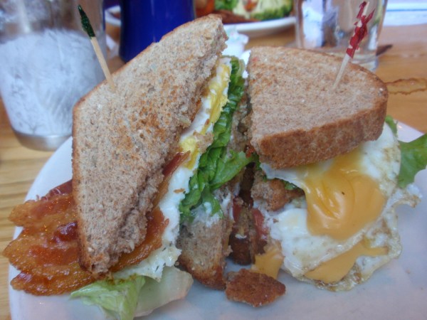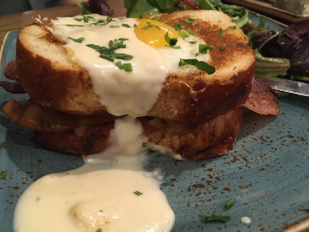 The drink was a good lead in to my sandwich, the First Watch Modern Croque Madame, their take on the French Classic. Their Croque Madame starts with grilled Buttered Challah bread then adds on layers of Cheddar and Monterey Jack, freshly sliced tomato and strips of hardwood smoked bacon. The concoction is topped with a sunny side up egg and an Alfredo-esque sauce of Parmesan cream sauce and fresh herbs. On the side, for the sake of balance, the dish includes a pile of organic leafy greens dressed with a hint of lemon. For a quick aside. the Croque Madame is the better half of the Croque Monsieur, a classic ham and cheese sandwich which appeared on French menus before World War One. The Madame is often known for its cardiac challenging extravagance. The First Watch interpretation makes bacon the meat of choice and I can find no fault in that. It is a good sandwich, and as with other croques I have consumed over the years, the egg makes the sandwich, much like the woman makes the man.