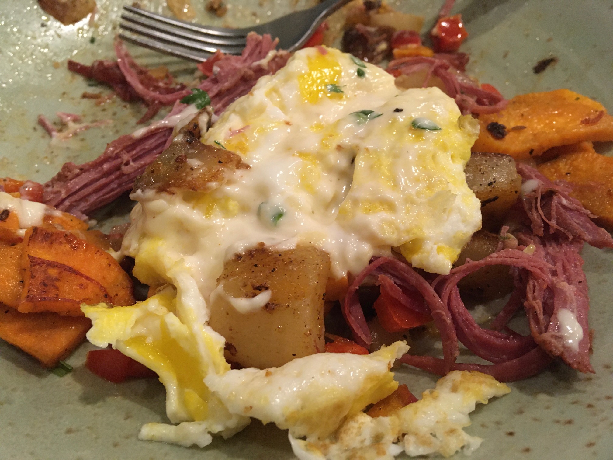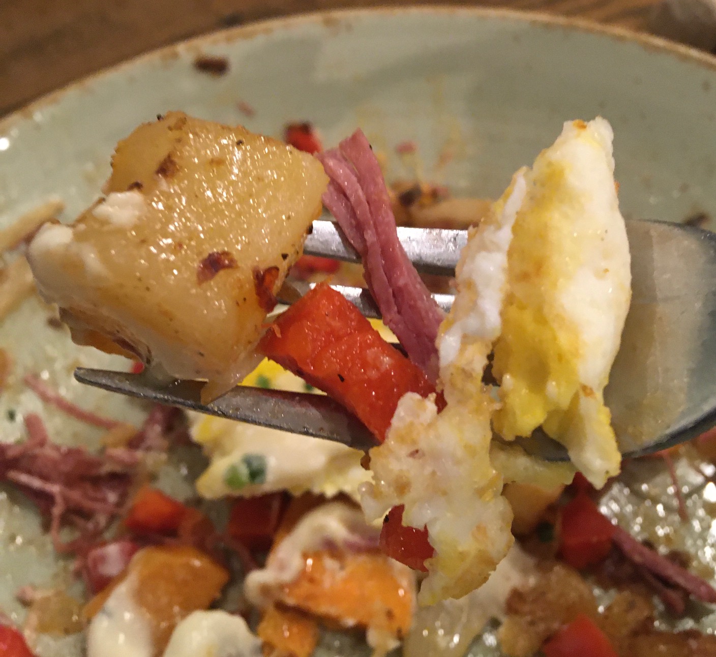 My wife gladly volunteered for the Brisket Corned Beef Hash. She was very happy with the perfect combination of shredded /pulled corned beef, seasoned cubed seasoned potatoes, house-roasted sweet potatoes slices, onions and red bell peppers topped with two cage-free eggs (we opted for scrambled) Parmesan cream sauce and fresh herbs. She was kind enough to save me a bite. We both agreed, that this was our favorite dish out of all we sampled and we would love to see this move to the main menu come wintertime and after. While is reads like a very heavy dish, it tasted quite light with all of the flavors blending well for a tasty meal any time of day.