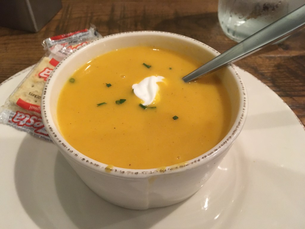 I end for recitation of selections with what I tried first, Butternut Squash Bisque. This soup resonated with the flavors of fall for me. The pureed butternut squash base was complimented a hint of carrot for sweetness and a touch of nutmeg then garnished with all-natural sour cream and a dash of fresh herbs. The origin of bisque is French as well, just think of it as a thick, creamy soup. This is the premise that First Watch delivered.