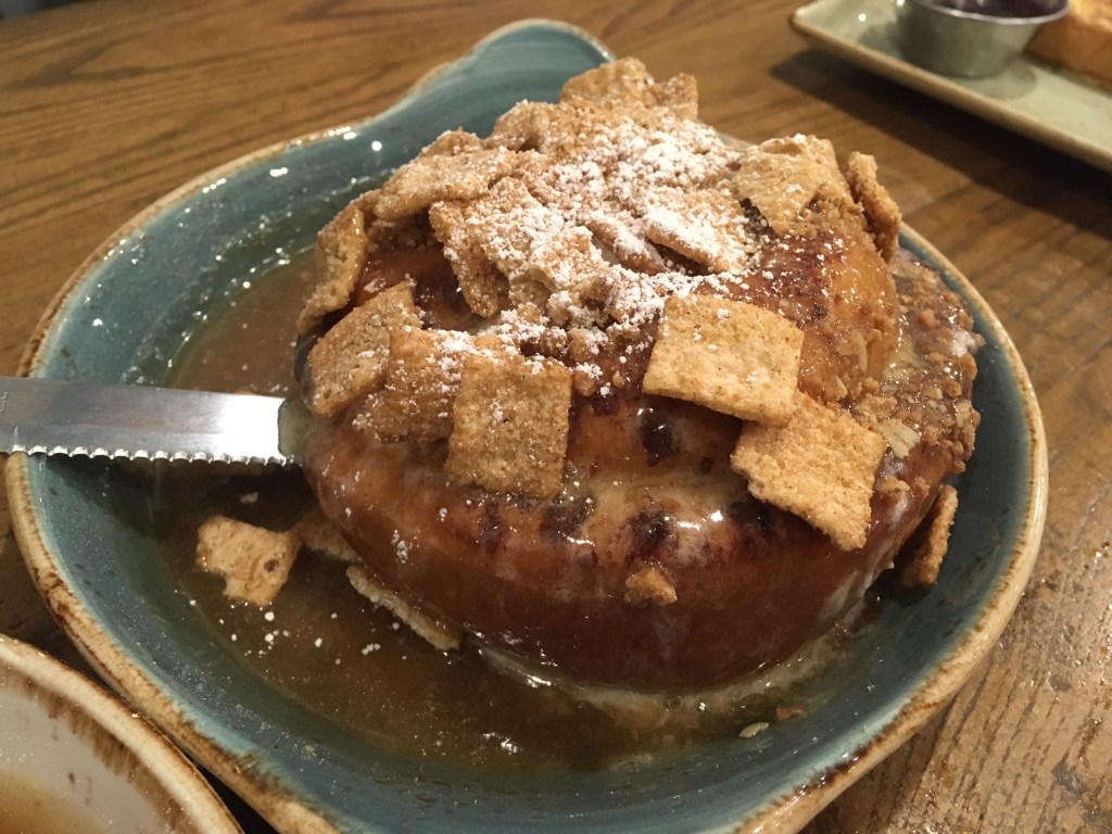 My mother in law choose the Caramel Crunch Cinnamon Roll as her selection – which was pretty amazing since she is the most health conscious of our entire crew for this outing. We collectively shared the second roll we ordered for the rest of the table. These giant cinnamon rolls were topped with cream cheese icing, brown sugar caramel sauce, Cinnamon Toast Crunch cereal and cinnamon streusel with a dusting of powdered cinnamon sugar on top. The rolls were light and flakey. The dense, flavorful sauce coasted my tongue like a bear skin rug in front of the fireplace on a chilly fall night. It tasted heavy and I wanted more after each heavy bite. I am fairly certain it added one pound per morsel.