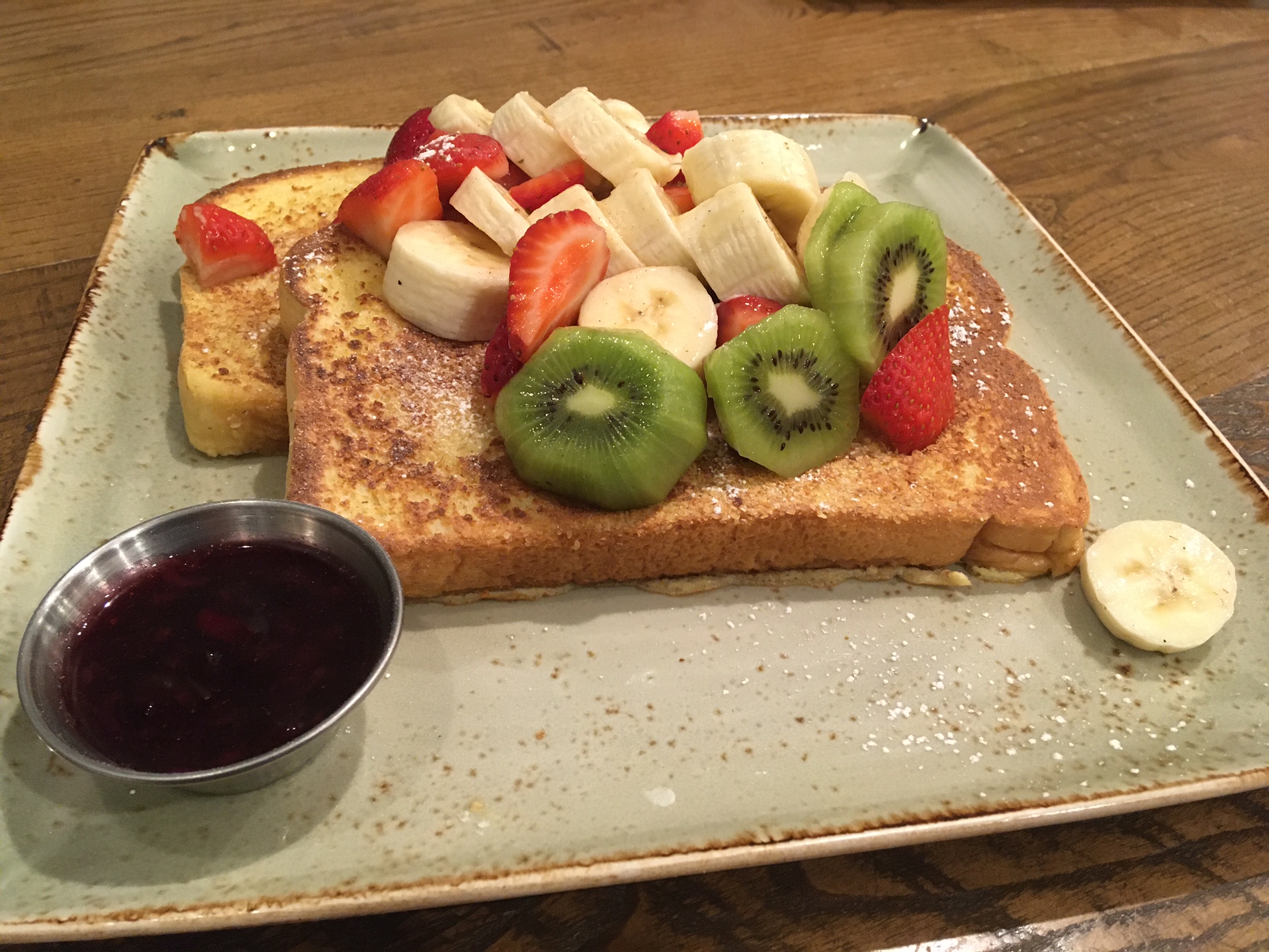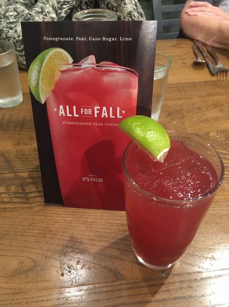 While not on the fall menu, my mom’s order of Floridan French Toast was perfect for her. It appears on the year round menu. It consists of thick-cut brioche bread with wheat germ and powdered cinnamon sugar, with fresh banana, kiwi and seasonal berries piled on top. All in all, the Fall into Fall Menu was a fine meal for all of us and I am glad there is still time to go back and sample several of these fall themed menu items again.