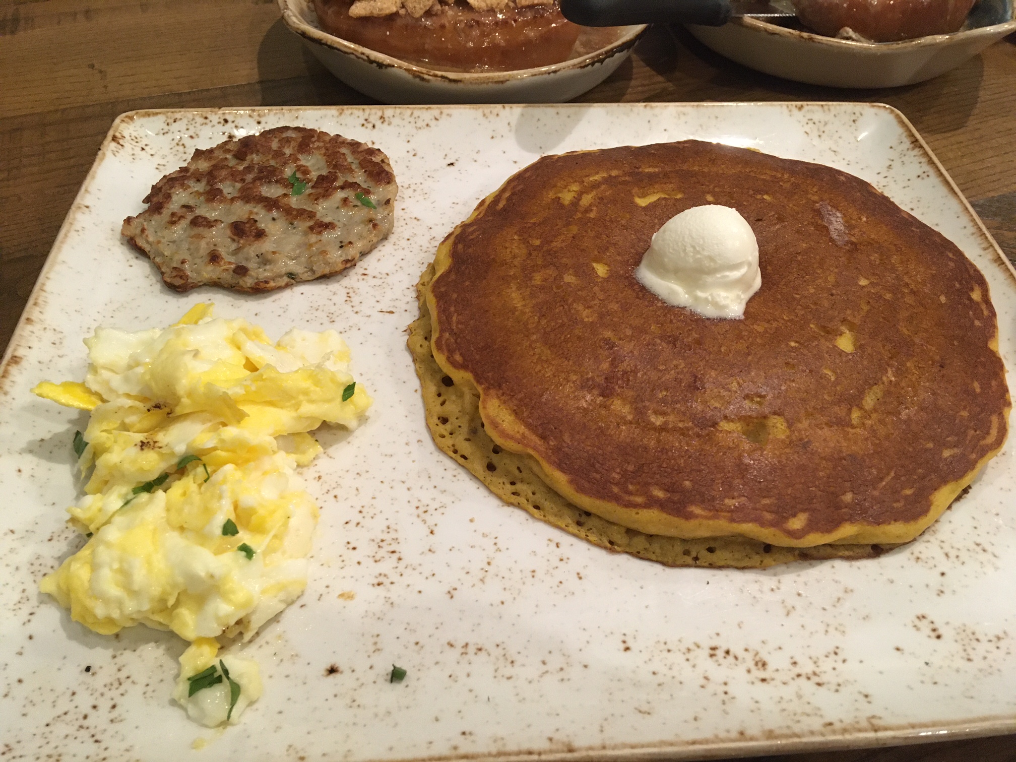 Everything was served fairly quickly en masse to our posse. After chatting with the ladies in my party I looked over to my son to ask how he was liking his pumpkin pancake breakfast – and saw that there were only two bites of pancake left on an empty plate. So that let me know that he liked his meal. Fortunately for me, I took a photo before I passed the dish to him. The Pumpkin Pancake Breakfast included: two cage-free eggs cooked any style (he opted for scrambled) a very large spiced Pumpkin Pancake with a cone of butter dolloped in the center and a Jones Dairy Farm grilled all-natural savory chicken sausage patty. My son loves breakfast and while this might be considered too fancy for many seven year olds he said he loved it all. For the one bite of pancake I did get to try, I found it had enough subtle pumpkin flavor to be enjoyable but not so much that it tasted like an over the top pumpkin spiced (everything) which is ubiquitous for the season.