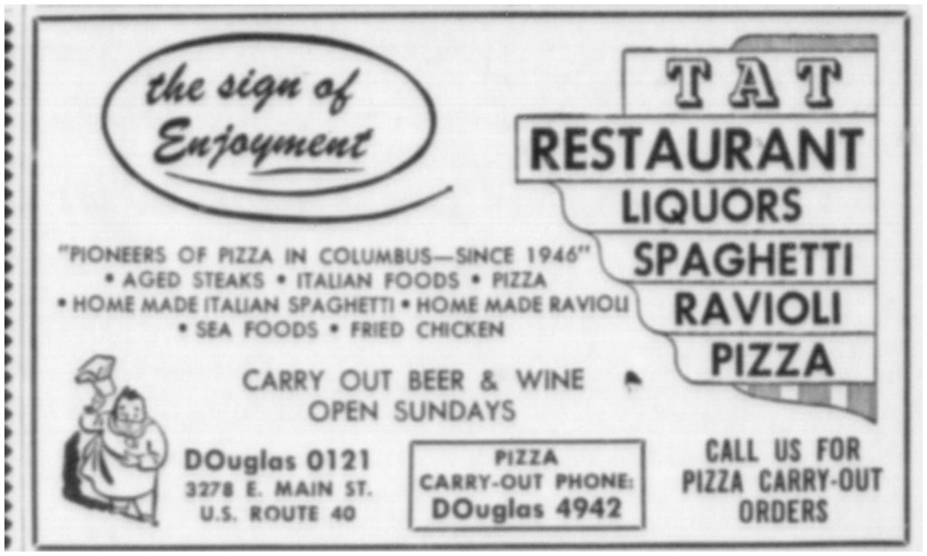 “Progress” in the form of new highways, cut up the Flytown neighborhood in the early 1950’s and forced TAT to move. Pete and Philomena opened the new location on the growing east side at 3280 E. Main St at South Hampton Road (it remained there until 1965). The couple continued to serve food that reflected Pete’s Sicilian (Ficara) roots and the recipes Philomena brought from Naples…and of course pizza. In 1955 (or 1954), Jimmy Corrova and his wife, Dolores, opened a second TAT at East Broad Street and James Road. In 1962 the family added a location at Livingston Avenue and Beechwood Road. This was followed by a pizza focused location on the west side, the TAT Pizza Carry Out at 3858 Sullivant Ave (which became Minelli’s Restaurant & Pizza Carry Out in 1967). During the brief tenure as a TAT, the west side location was very busy with Jimmy Corrova recalling they used “five to six delivery wagons and sold 600 pizzas per night on Friday and Saturday”. After the death of patriarch Pete, followed by Jimmy having a heart attack, the family decided to merge the two remaining east side TAT’s in 1980 which remains TAT’s location today, 1210 South James Road (at Livingston Avenue).