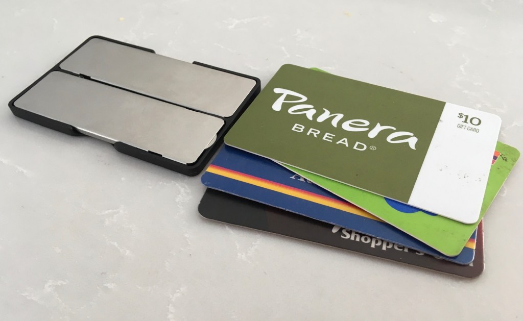 The flatware set is the thickness of 4 credit cards, so it will not fit into the typical credit card slot in a leather wallet but it does fit snuggly in the the pocket that is typically underneath the slots or in the billfold section of a wallet. If you have a badge for work with a plastic holder, this would fit in with many work ID’s.