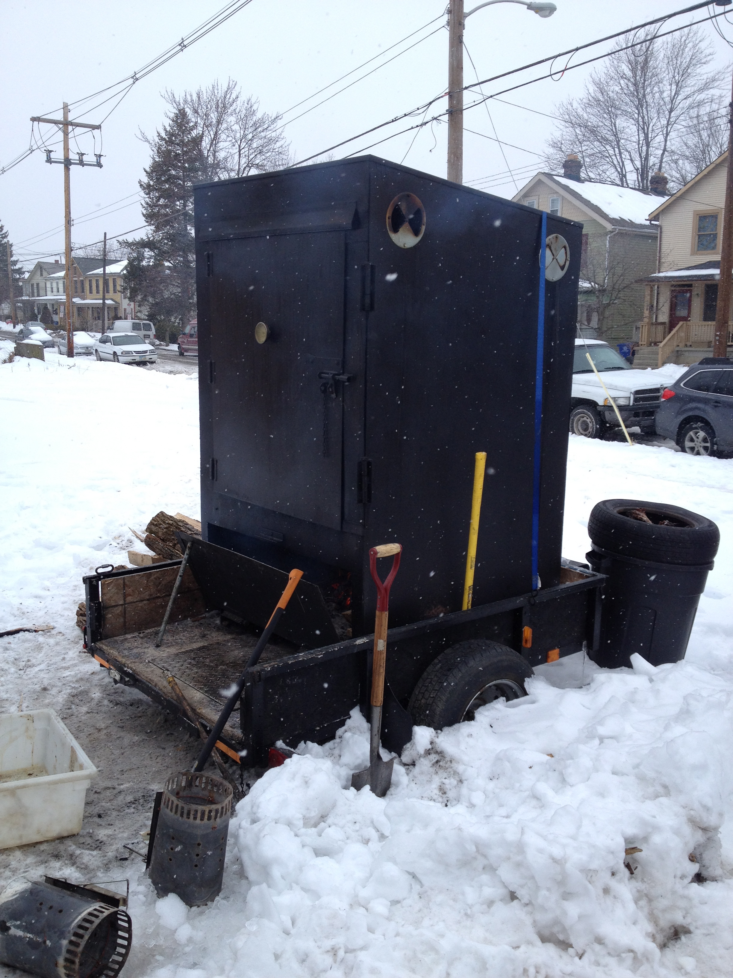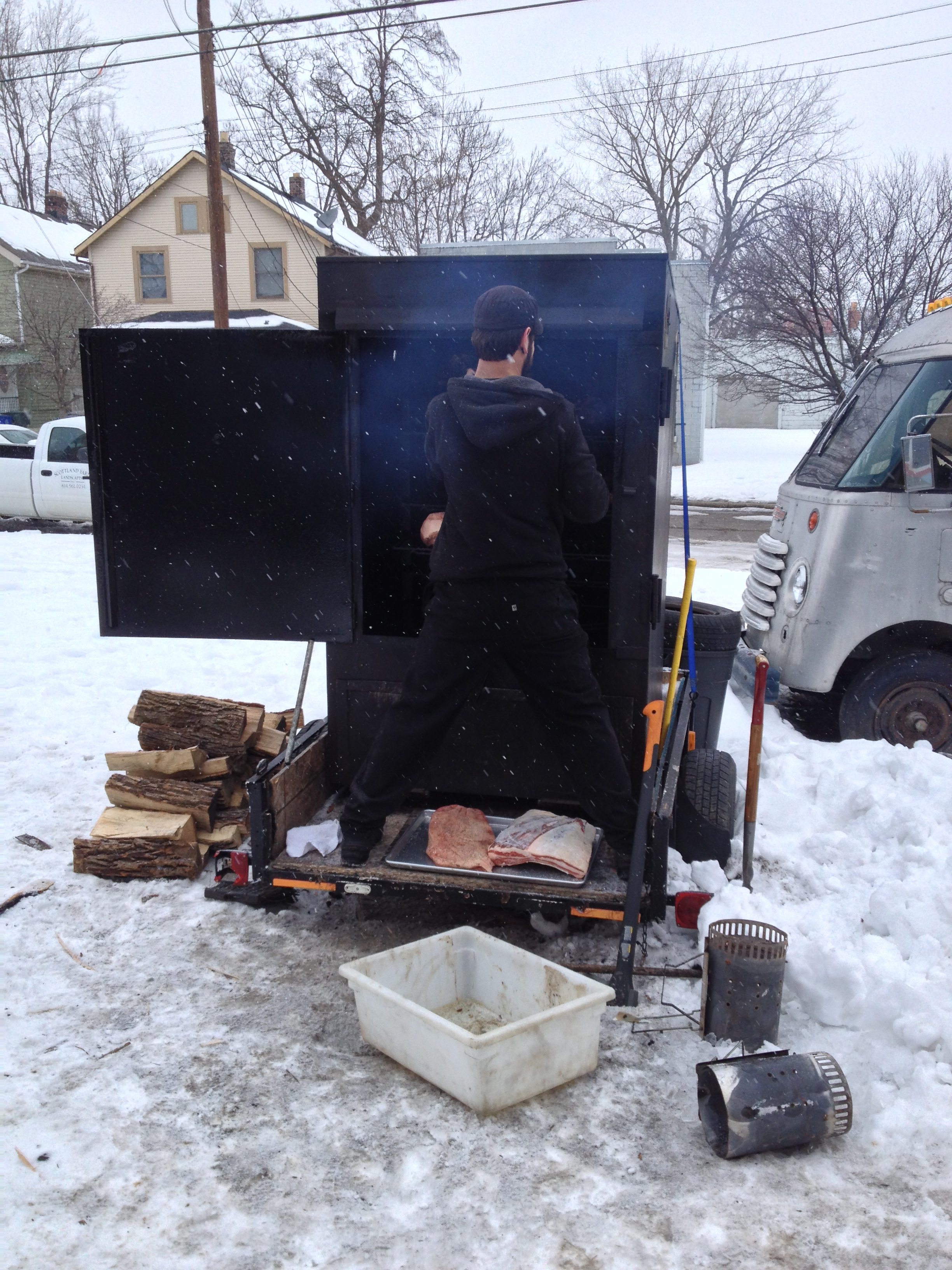 You may have noticed it has been very cold all winter. That has not hindered Dan. Schools and businesses may close. Seventh Son was even hit by a truck – but Dan has continued to press on. Rain or shine, cold or colder, Dan monitors his smoker all night and throughout the morning. He checks on his meat every 45 minutes to one hour. You may be scratching your head at this point so let me elaborate. Dan takes cat naps in his truck all night, getting up to check his temperatures every hour. If he loses his fire or his temperatures go under his target mark, he will need to cook an additional four hours to make up for every 1 hour he loses. So how exactly does one comfortably sleep in a food truck? Well, one does not. See the photo below as Dan demonstrates how he spends his late night Fridays and early morning Saturdays.