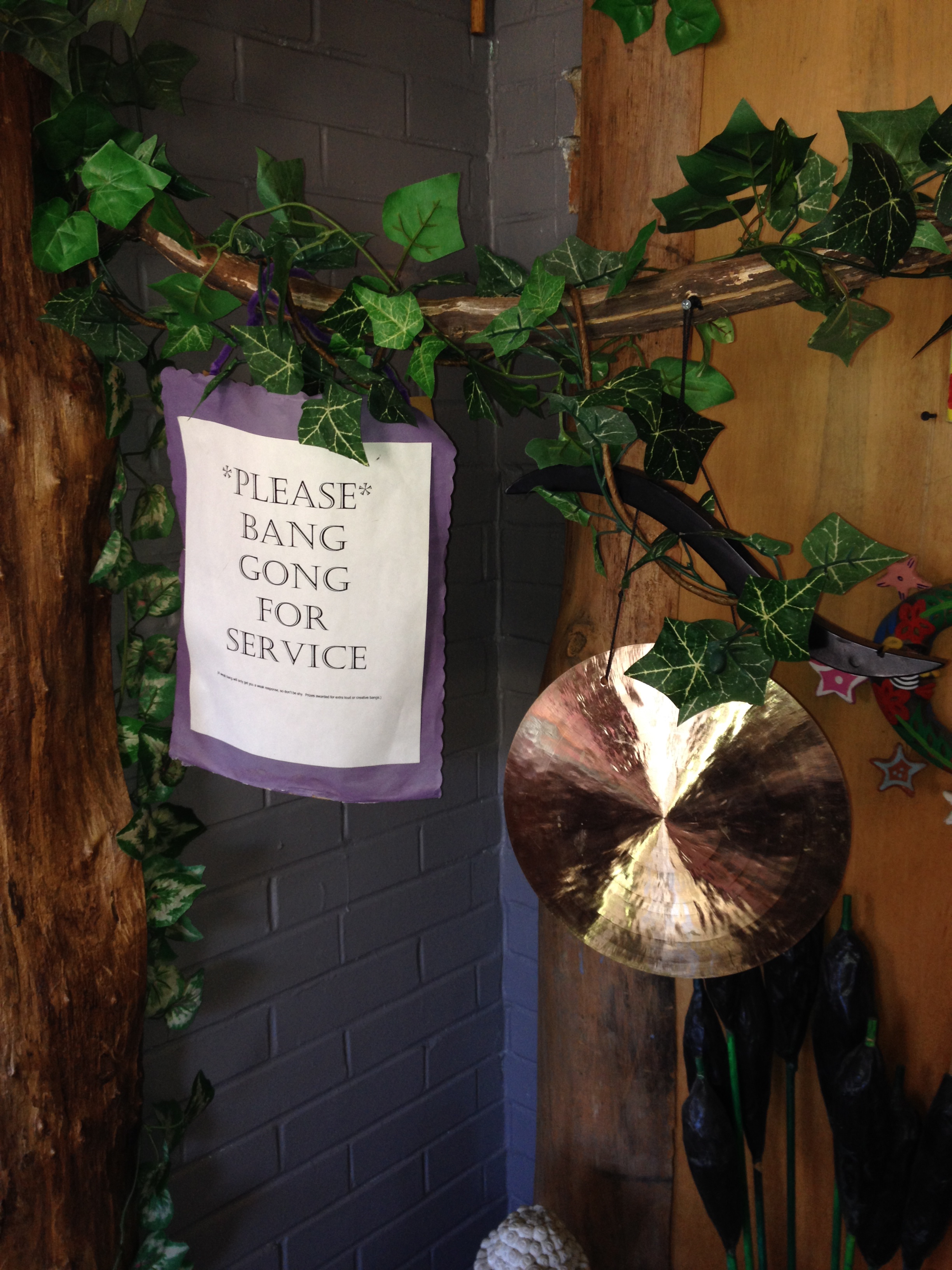 Upon arrival, my companion was a bit skeptical about my choice of dining establishment for first lunch. He was very hungry to the point of pre-crankiness and by nature he is very focused on the appearances of things and design. The exterior of the place would best be described as unassuming. While I am a variant of hippy my companion is anything but and I think he experienced minor discomfort when we saw the sign below.