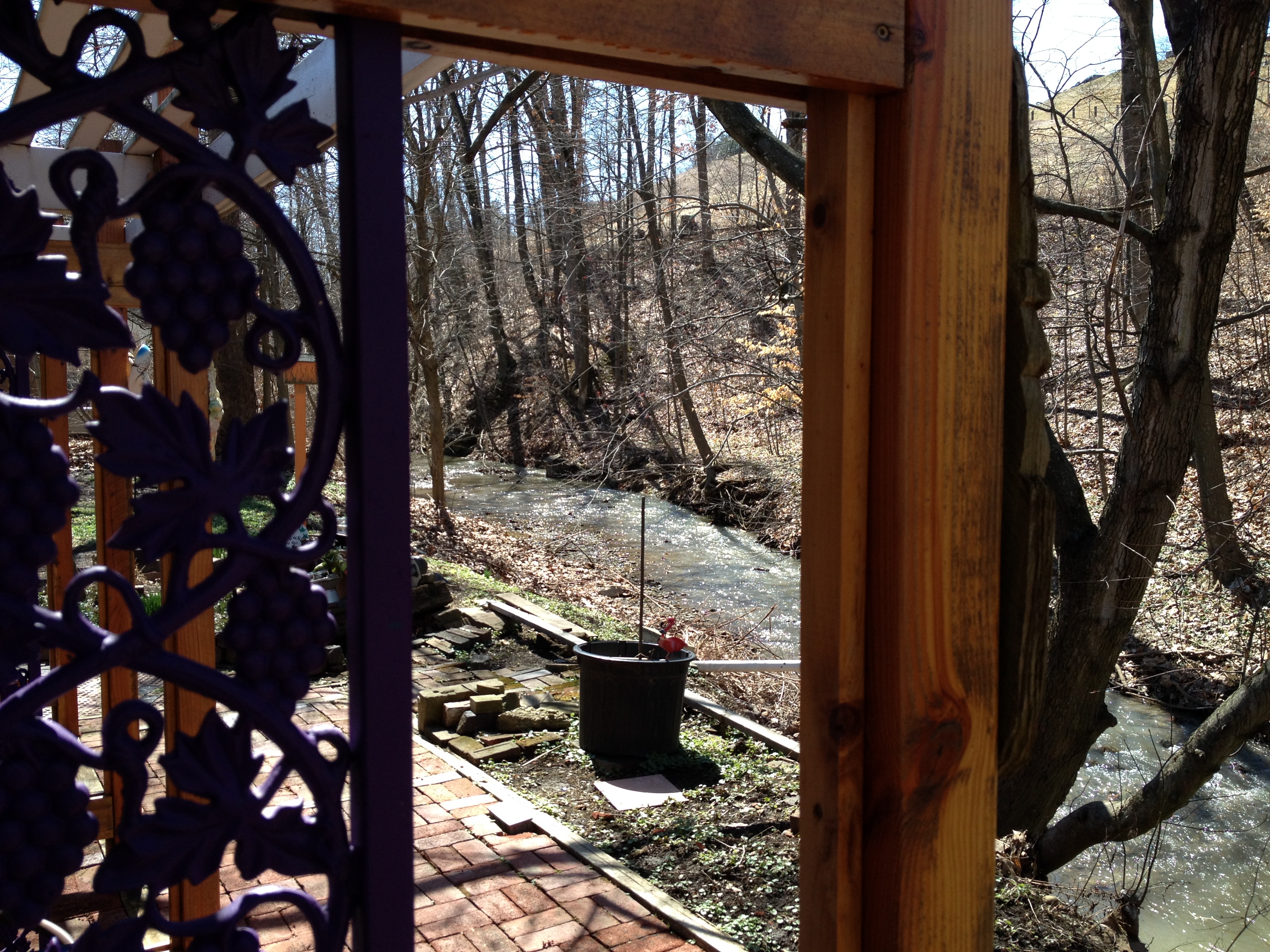 So of course I banged the gong. We waited quite some times and the gong was not responded to so I barged into the room and asked the most hippy looking person if it was OK to seat ourselves. It turned out that person was a customer but a very pleasant young lady then took care of us and gave us her favorite table for two. You can see the table below, the booth we sat in reminded us of an old train car dining station. I am happy to report I could fit in. Looking out the window I saw a peaceful, babbling brook, many trees, some interpretive art and an odd assortment of eclectic items decorating the landscape including numerous block pavers (expect a post about that in Bricks of Ohio Blog soon). I knew the second I sat down I had found my new spot.