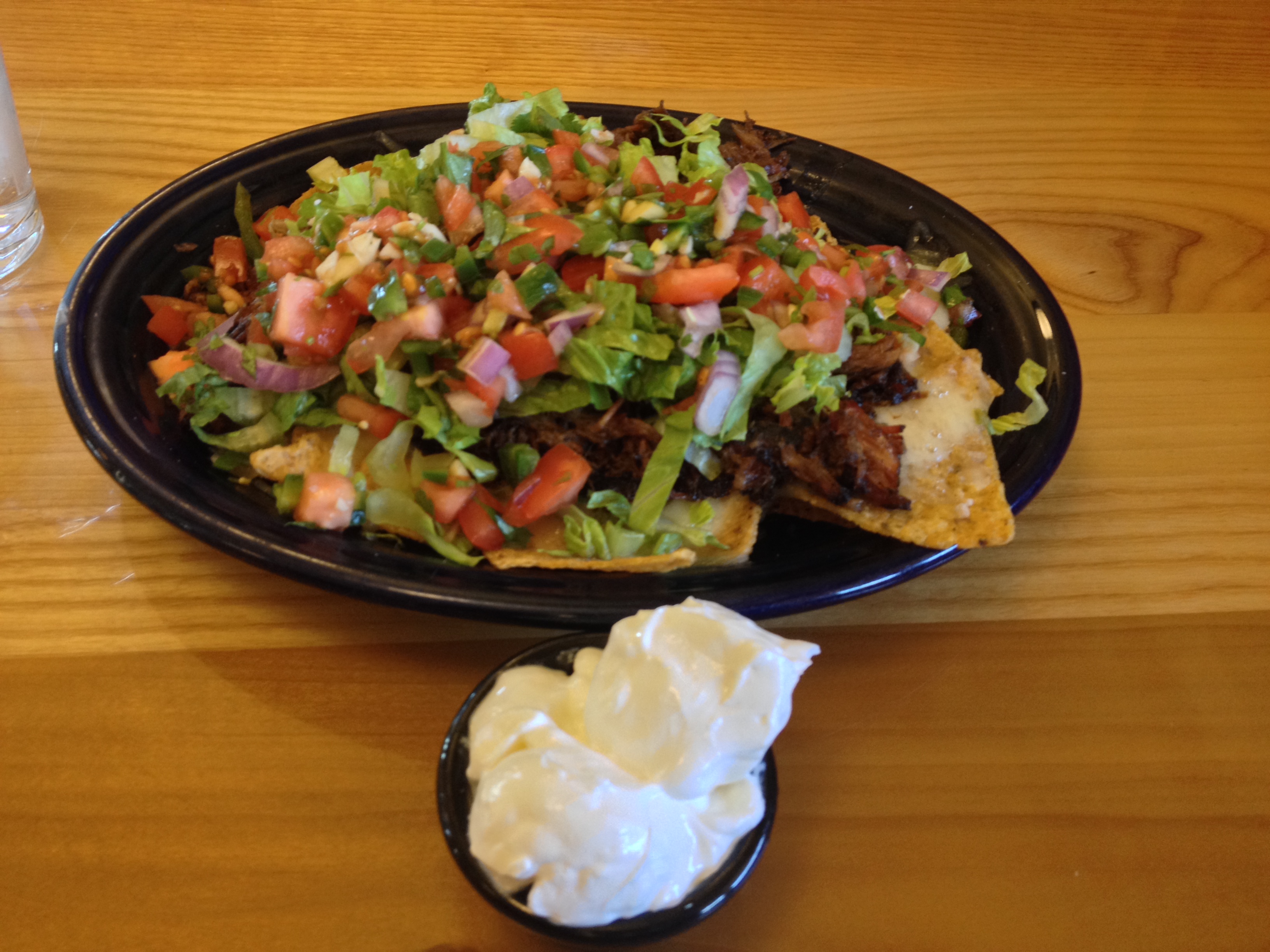 On our visit we tried the nachos featureing a mountain of Shagbark chips, cheese, smoked pulled pork, lettuce and a more diced tomato de gallo than pico de gallo with a side of sour cream. The nachos were good but they would have benefited from more “goo” either more cheese, a side of BBQ sauce, or something to add some wetness to the dryness (not a bad dry) to the chips and pulled pork.