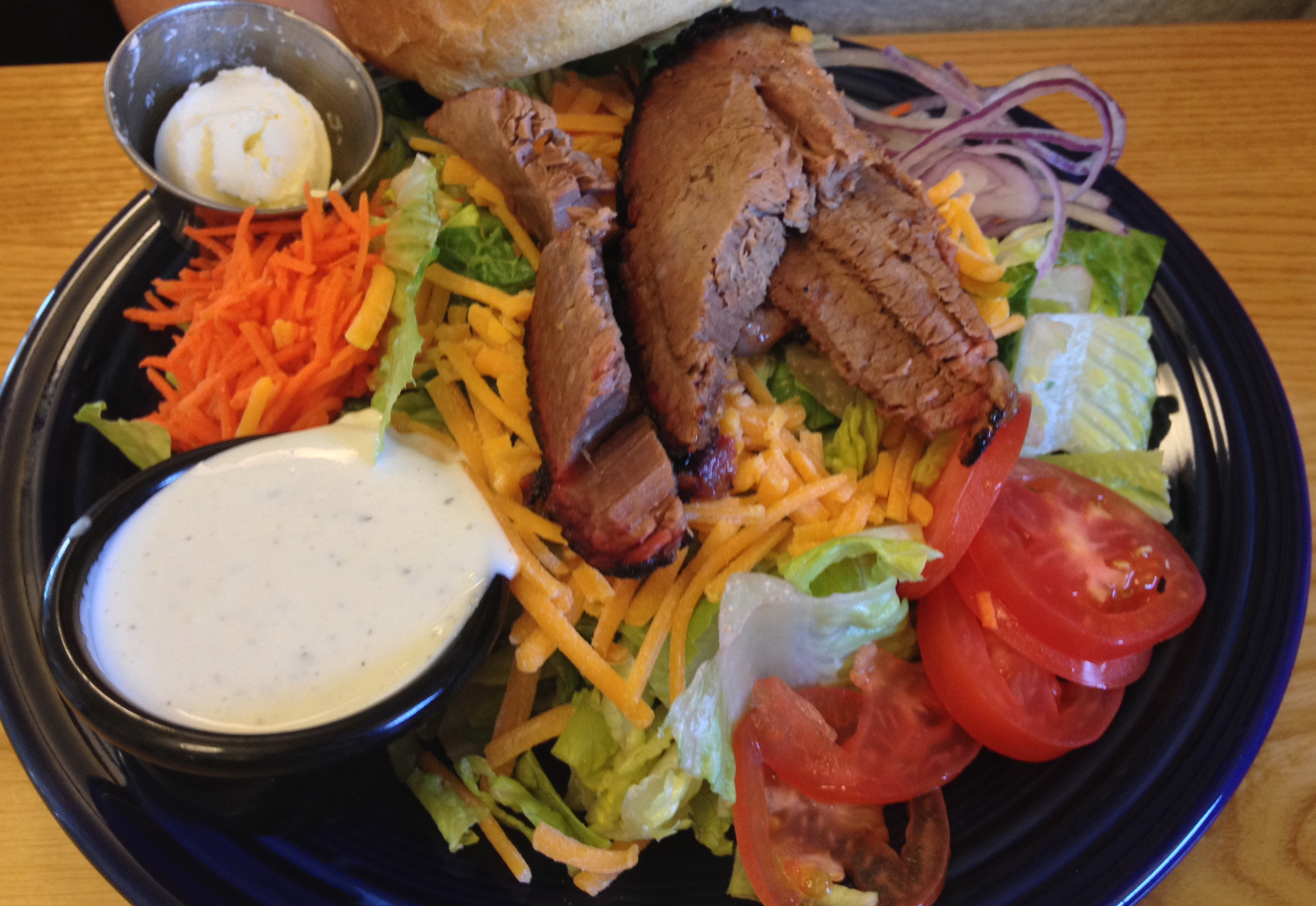 Mrs. Gourmand opted for the Warm Brisket and Bleu salad (opting to sub in cheddar due to her knocked up state) which included: slabs of slow-smoked, Ohio-raised brisket served warm on romaine lettuce with cheese, red onion, carrots and tomato. Mrs. Gourmand and I thought the brisket was very well crafted – tender and flavorful without being overly smoked. CMH Tobias also gave the scraps two paws up when he tried them later. The salad came with a fresh baked roll which could easily be converted to a sandwich bun for some of the brisket.