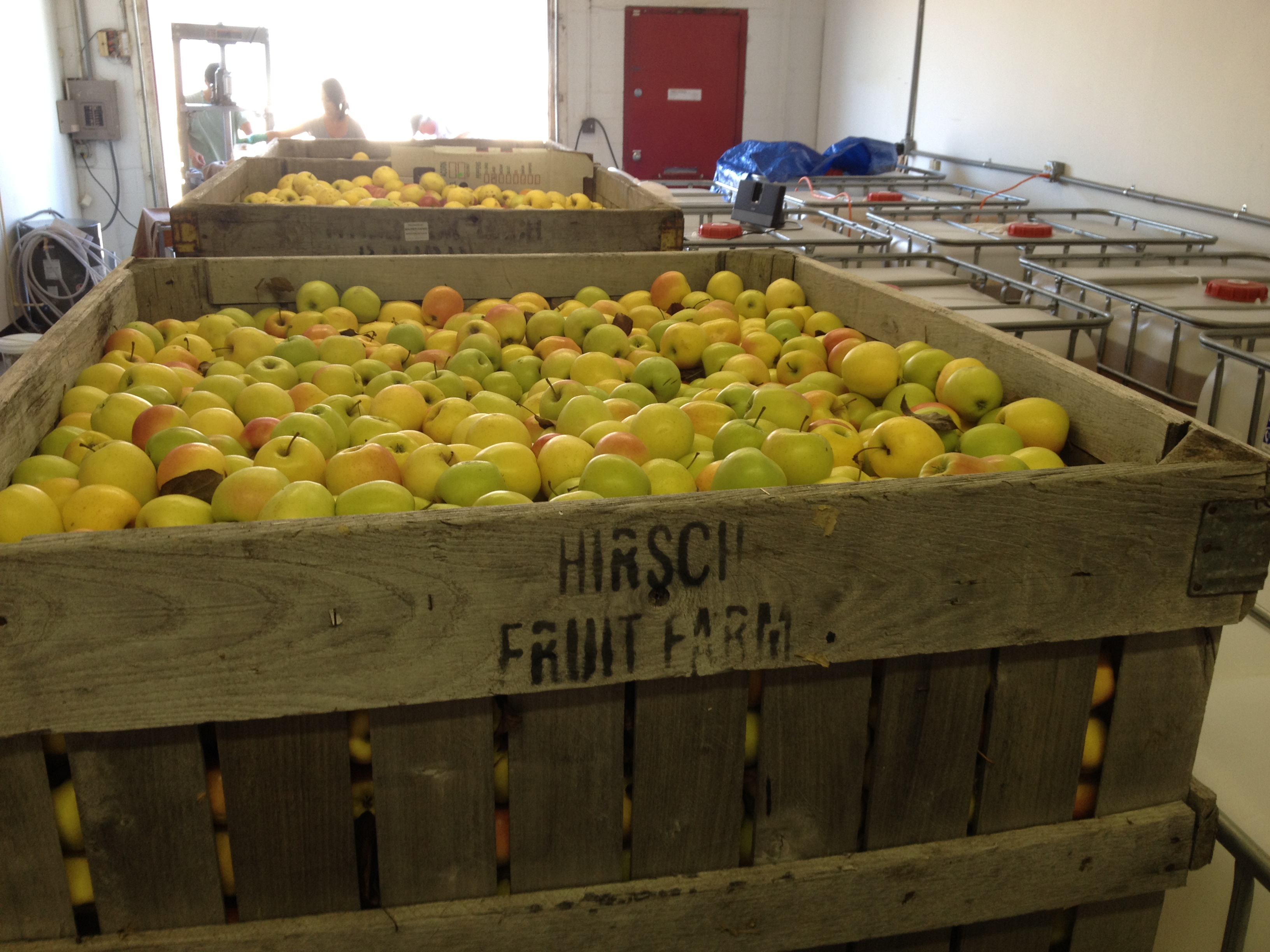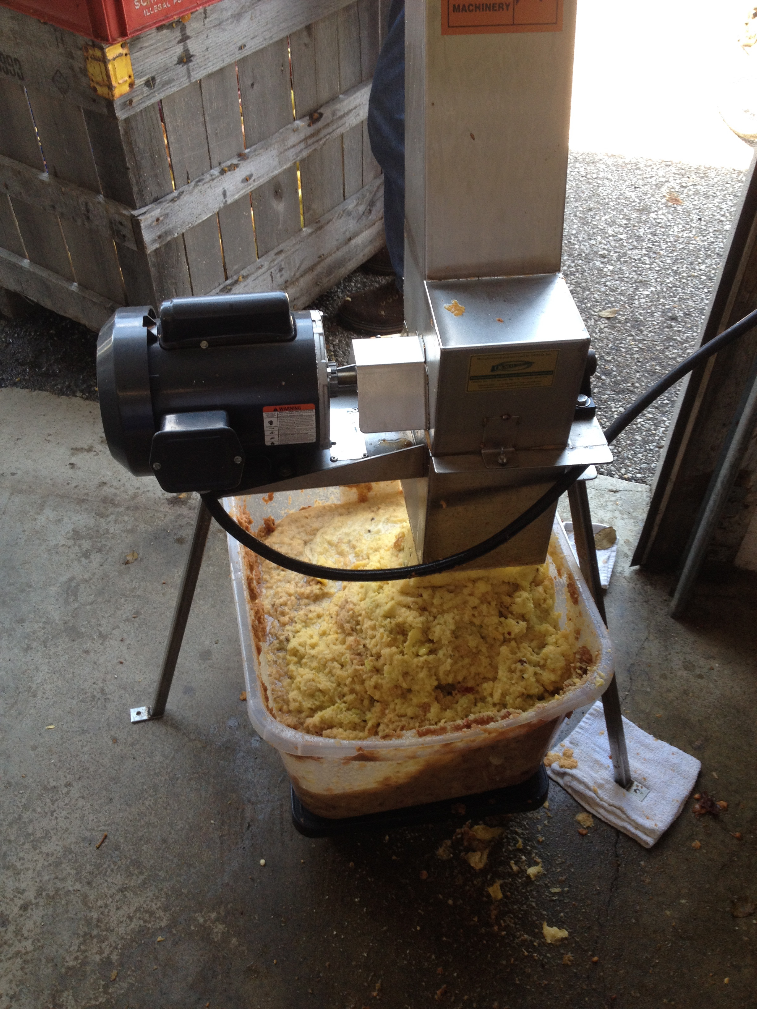 As the apples get sorted into milk crates and buckets, the apples go down a chute of a device that looks a lot like a chipper to get mashed into apple pulp.