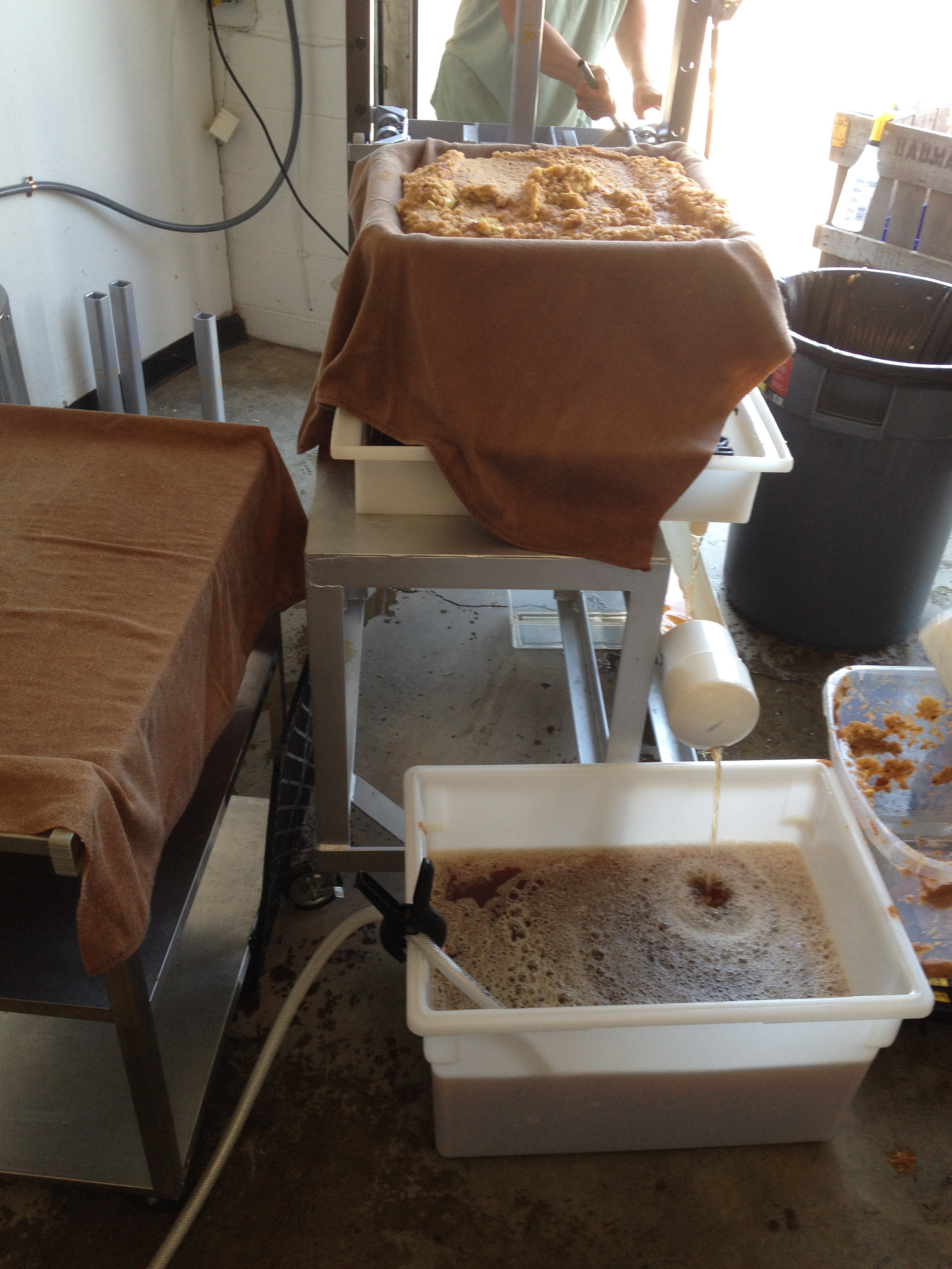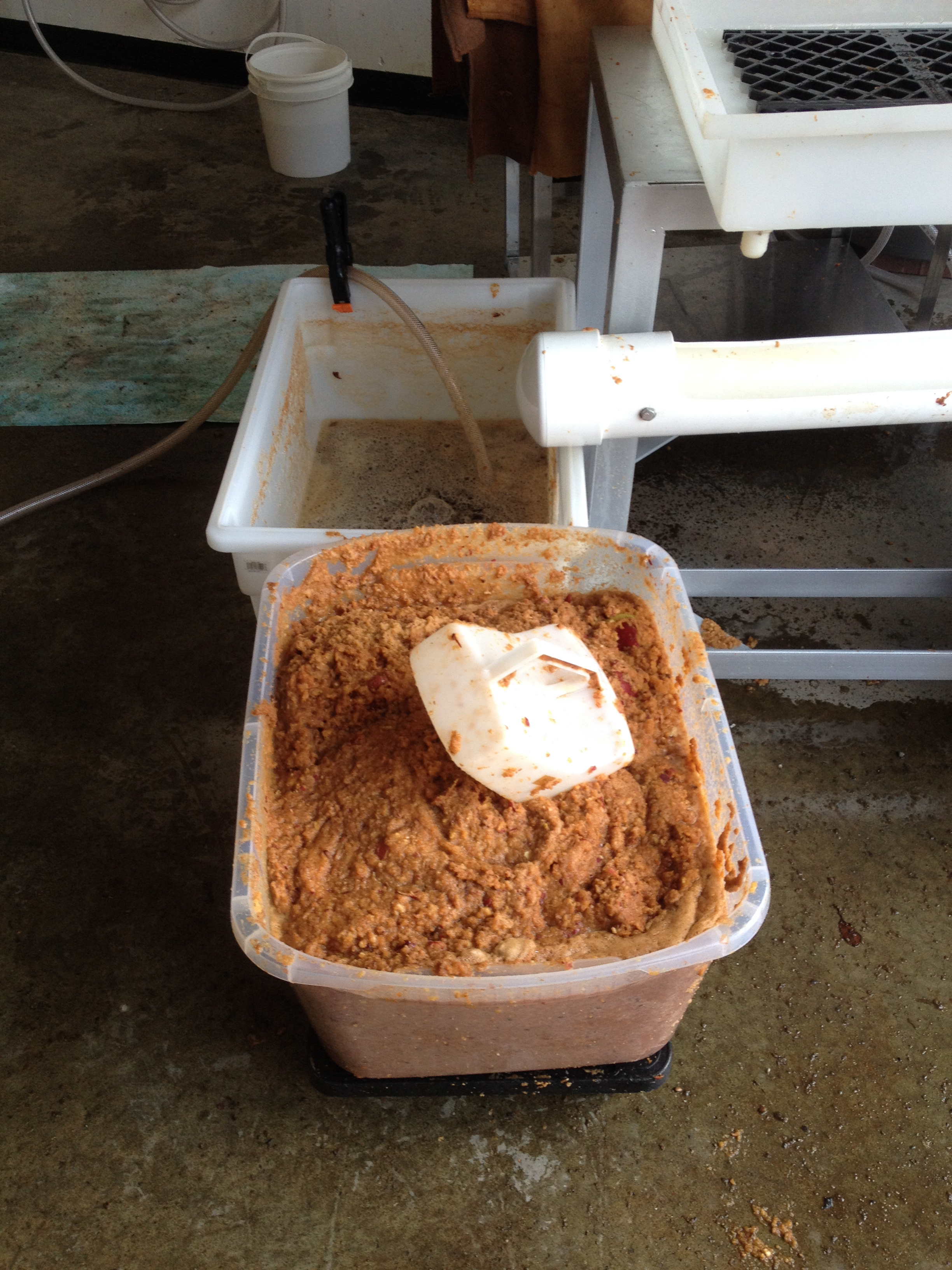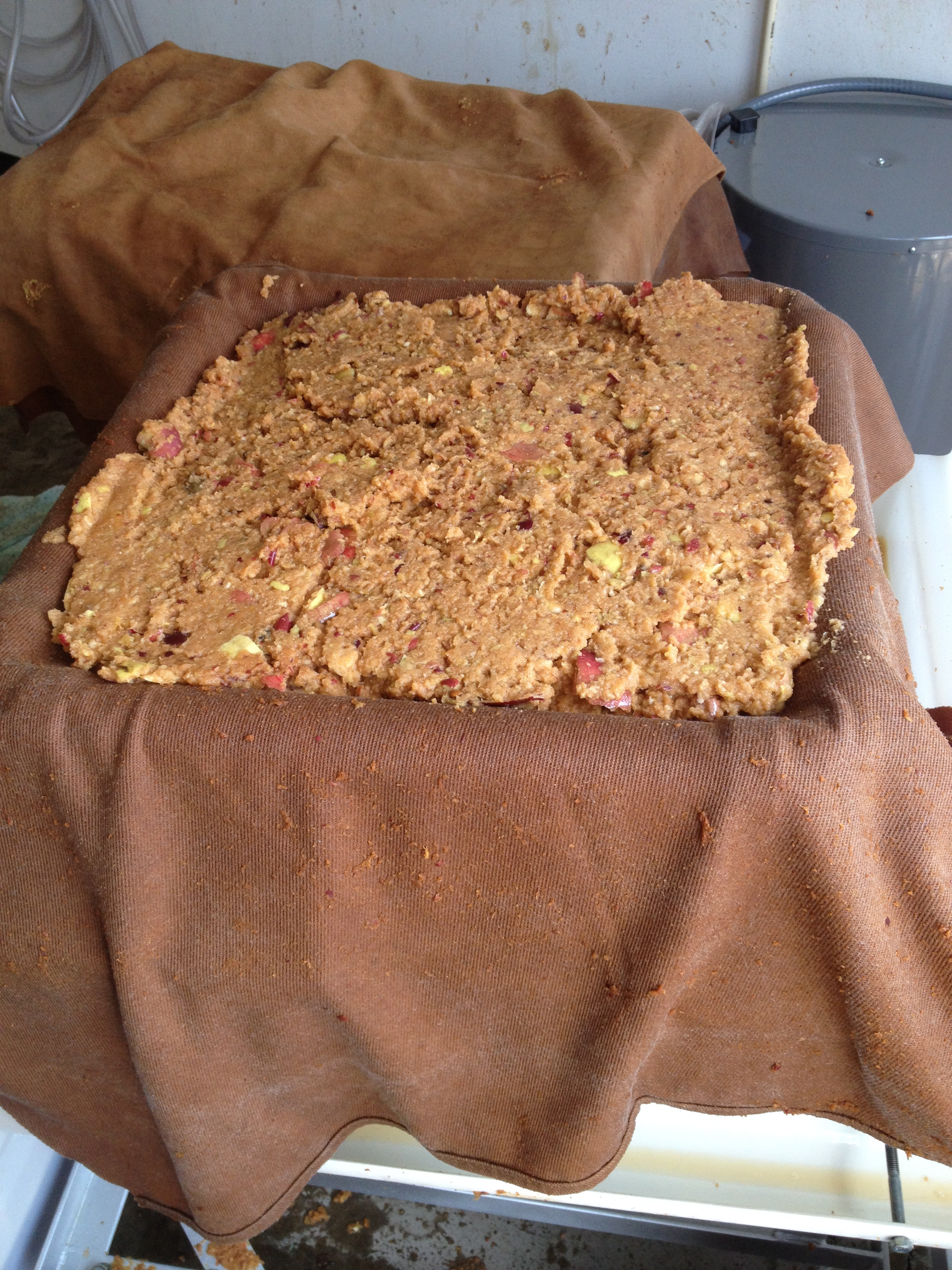 Once the press gets going, the juice really starts to flow (down a long open trough) to a bin. Once the bin gets to a certain height, a pump gets switched on to transfer the juice to a holding tank (during my tenure I think we made about 300 gallons over four hours). After the pressing, the square molds are unfolded to start the “cheese” making process again. After the pulp is mashed, the residual looks like a very dry energy bar made by an eighties era hippy.