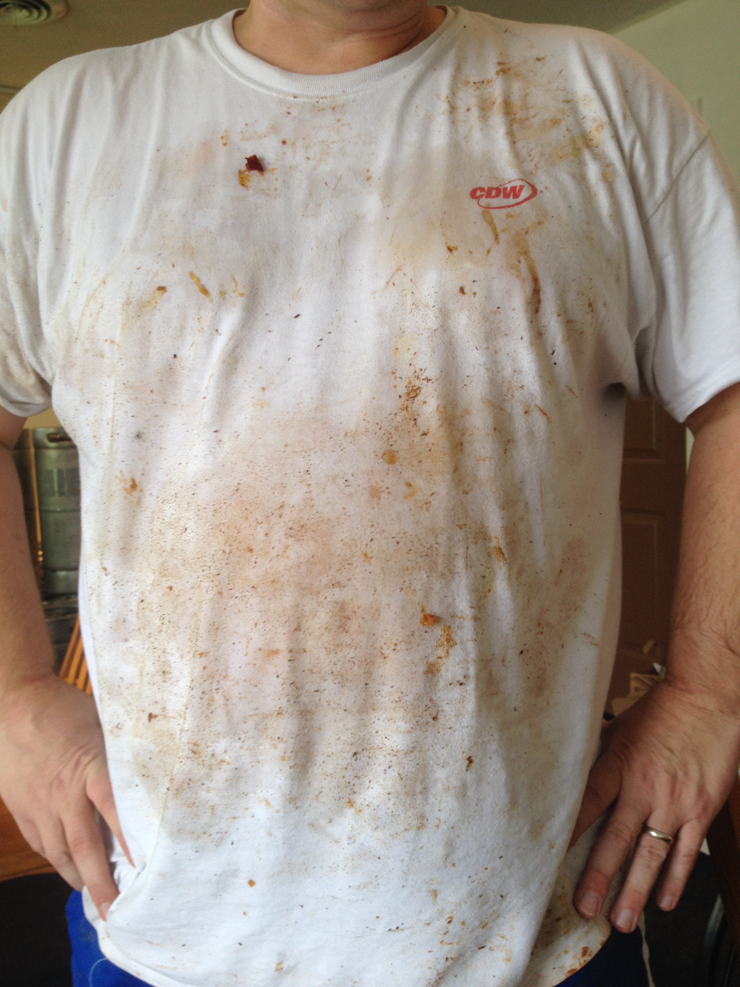 All in all, I was a great afternoon. If you are familiar with the story of John Henry (there is a statue down where my kin reside) if there was a production contest between a machine, Vic and myself, Vic would beat the combined efforts of the machine and my human self. It was hard, messy work but worth the effort. You can see my work shirt below….taken near the beginning of my labors.