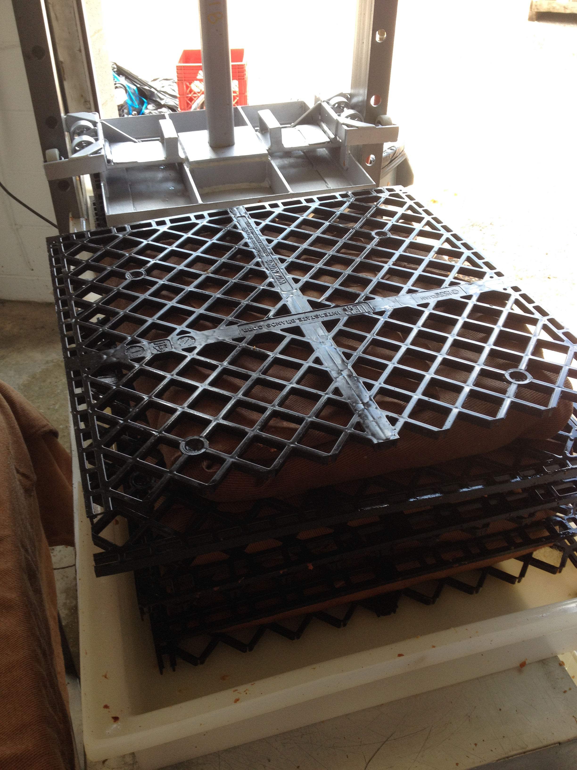 The pulp gets wheeled over to get crafted into sheets of “cheese”. The job of the cheese maker is to take scoops of pulp, and using a plastic mold and cheesecloth, create squares of apple pulp to stack on other squares to slide down to a press to squash (with 1000’s of pounds of pressure) to create juice.
