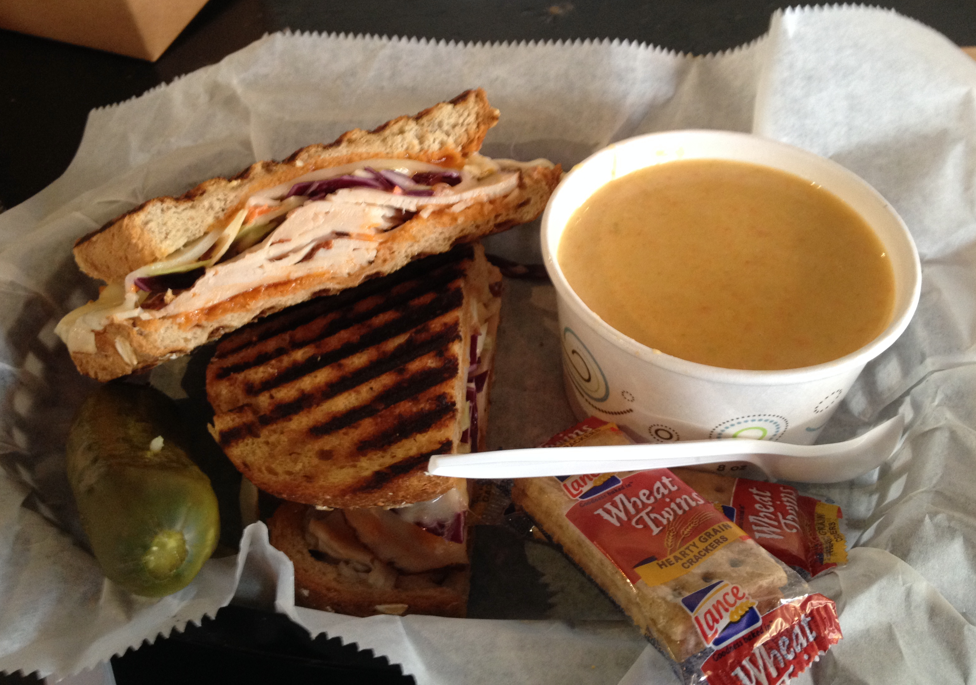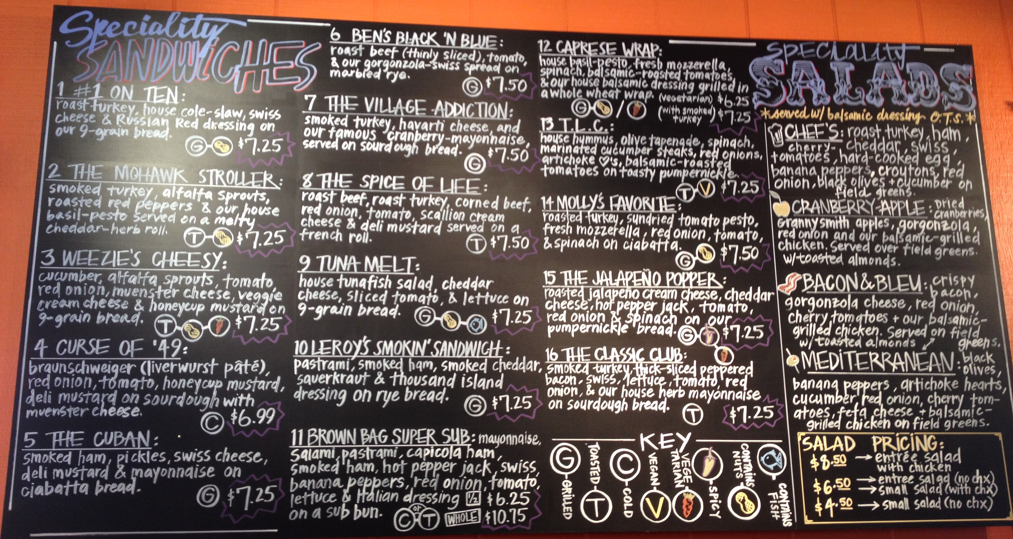 Take a look at the menu board above. In addition to a wide selections of sandwiches (cold, hot, toasted, grilled, vegan, vegetarian and more), you can build you own sandwich, choose from a selection of salads, soups, flatbreads, homemade sides and more. The sides are more than the typical potato and macaroni salad. The fresh selection of sides varies and it is always challenging to decide on just one. Deviled eggs are a standby and always in good supply. The dessert choices are deeper than one would expect from a kitchen this size. I’ve never encountered a dessert here that I did not like.