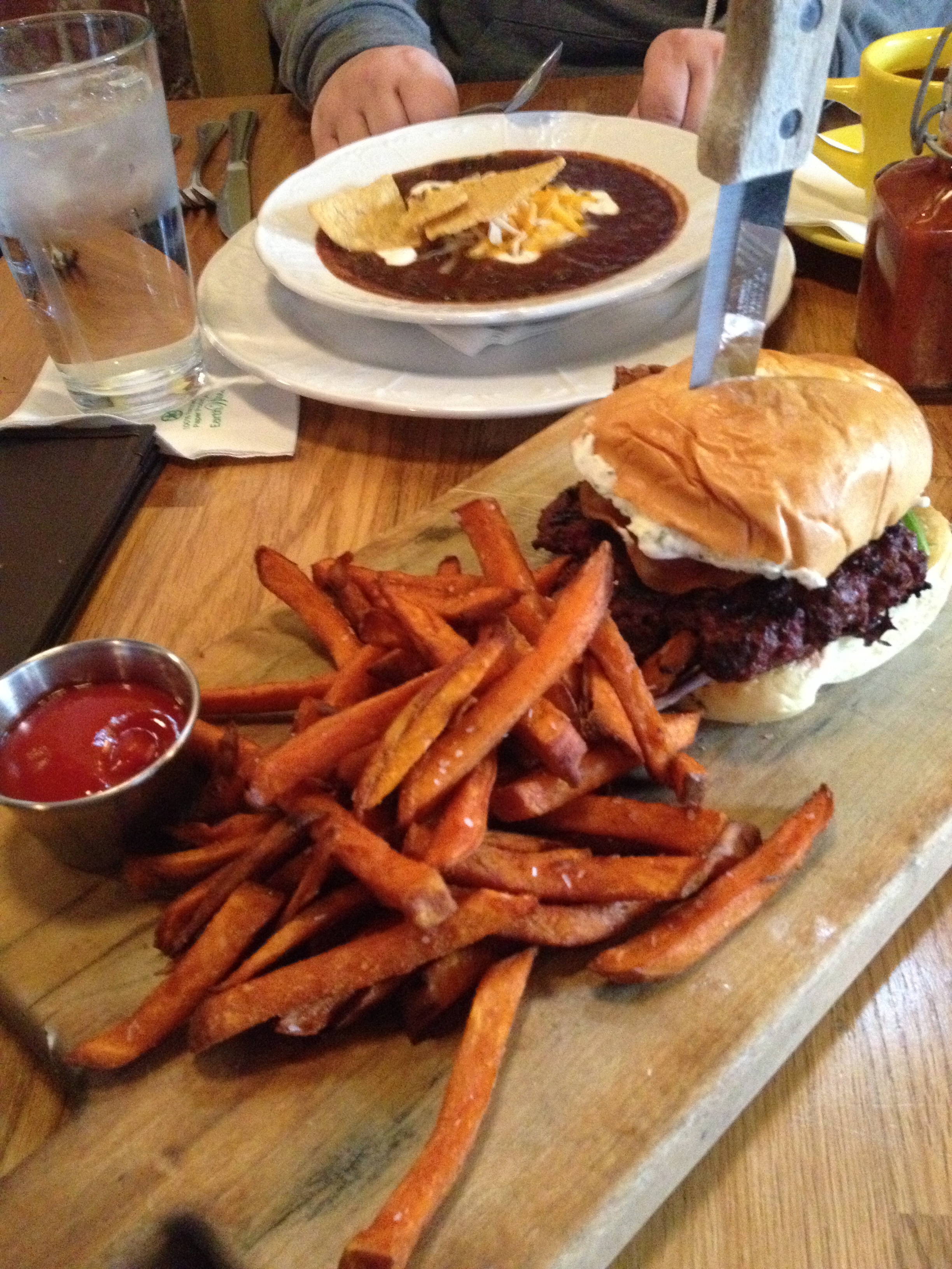 Speaking of the bar, it looks good. It looks inviting, it looks…..expensive. The bar top is copper-topped. The chairs are sturdy and comfortable. There are six 32 inch television screens mounted near the ceiling, so there is enough to support people who want to watch a game but not so many that it feels like a sports bar. To counter balance the TV’s – there are purse hooks strategically mounted at knee level at bar side. Purse hooks are important, all of my female friends tell me so. As for the rest of the decor, the bathrooms look great – small but functional with lots of tile. They (well at least the men’s room) have the look of a 1930’s tavern in the heart of Chicago or London. The inside dining area is a mix of high-backed booths, high topped tables and lower placed four tops. There are plenty of seating styles and arrangement to meet the needs of the solo gourmand, the party of seven or the family of three. All of the spaces are filled with items such as windows from a former school, wood from a barn and so on, creating a place that while just a few months old has a character of an establishment much older. The patio is perpetually filled and covered with plenty of umbrellas for protection from the elements. On the outside there is a bike rack (which seems continually full) to comfort bike enthusiasts and Millennial hipsters alike. So The Crest Gastropub may sound busy to readers and let me assure it is….to the point where the neighbors have grown a bit irked by the lack of easy parking access in front of their homes. The owners have made an effort to be good neighbors to their neighbors by asking guests not to park on certain streets near the business.
