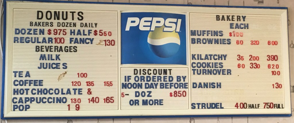 The Donut Scene has a large variety of cakes, cookies, apple fritters and such as well. I did not notice this until I left, but in reviewing my photos (see below) I spied a food item I have not encountered before: Kilatchy. Had I seen this at the time I would have ordered one. I think it may be a very interpretive spelling of Kolache. If you go to the Donut Scene, please find out for me and post here to let me know the story.